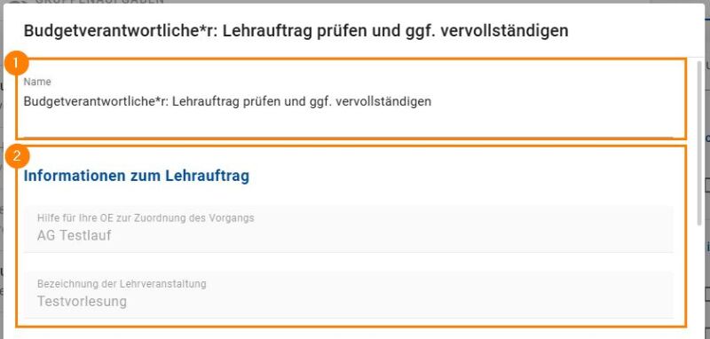 Nach dem Öffnen der Aufgabe wird Ihnen zunächst immer die Bezeichnung der Aufgabe angezeigt und in welche Rolle Sie diese ausführen (Nr. 1 im u.a. Screenshot). Darunter wird Ihnen eine Hilfe zur Zuordnung des Vorgangs – sofern die/der Antragsteller*in hier etwas eingetragen hat – sowie die Bezeichnung der Lehrveranstaltung aufgeführt (Nr. 2 im u.a. Screenshot).