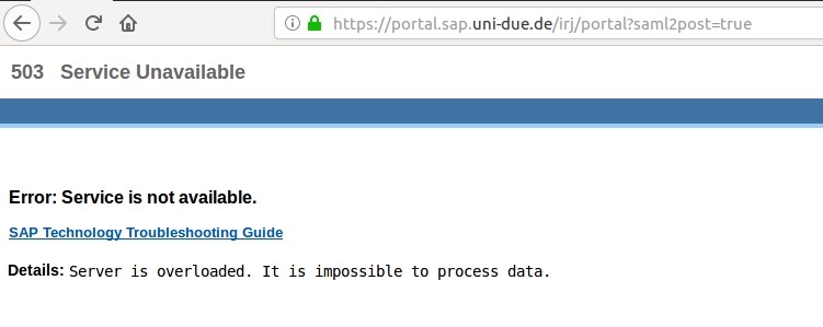Die Fehlermeldung 503 Service Unavailable mit der Begründung Server is overloaded ist nicht korrekt. Nachweislich ist das SAP-Portal nicht überlastet.