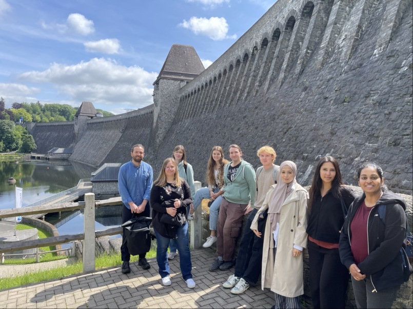 Bachelor- und Masterstudierende besuchten erneut die Große Dhünn-Talsperre, diesmal bei bestem Wetter. Erbaut zwischen 1975 und 1985, versorgt sie fünf Wasserwerke im Bergischen Trinkwasserverbund und dient zudem dem Hochwasserschutz. Die Exkursion wurde von den begeisterten Mitarbeitenden Mara Offermann und Thorsten Luckner geleitet. Ein besonderes Augenmerk galt wie auch im letzten Jahr dem Thermorüssel, der seit 2015 für einen ausgeglichenen Temperaturverlauf im Unterlauf der Dhünn sorgt.