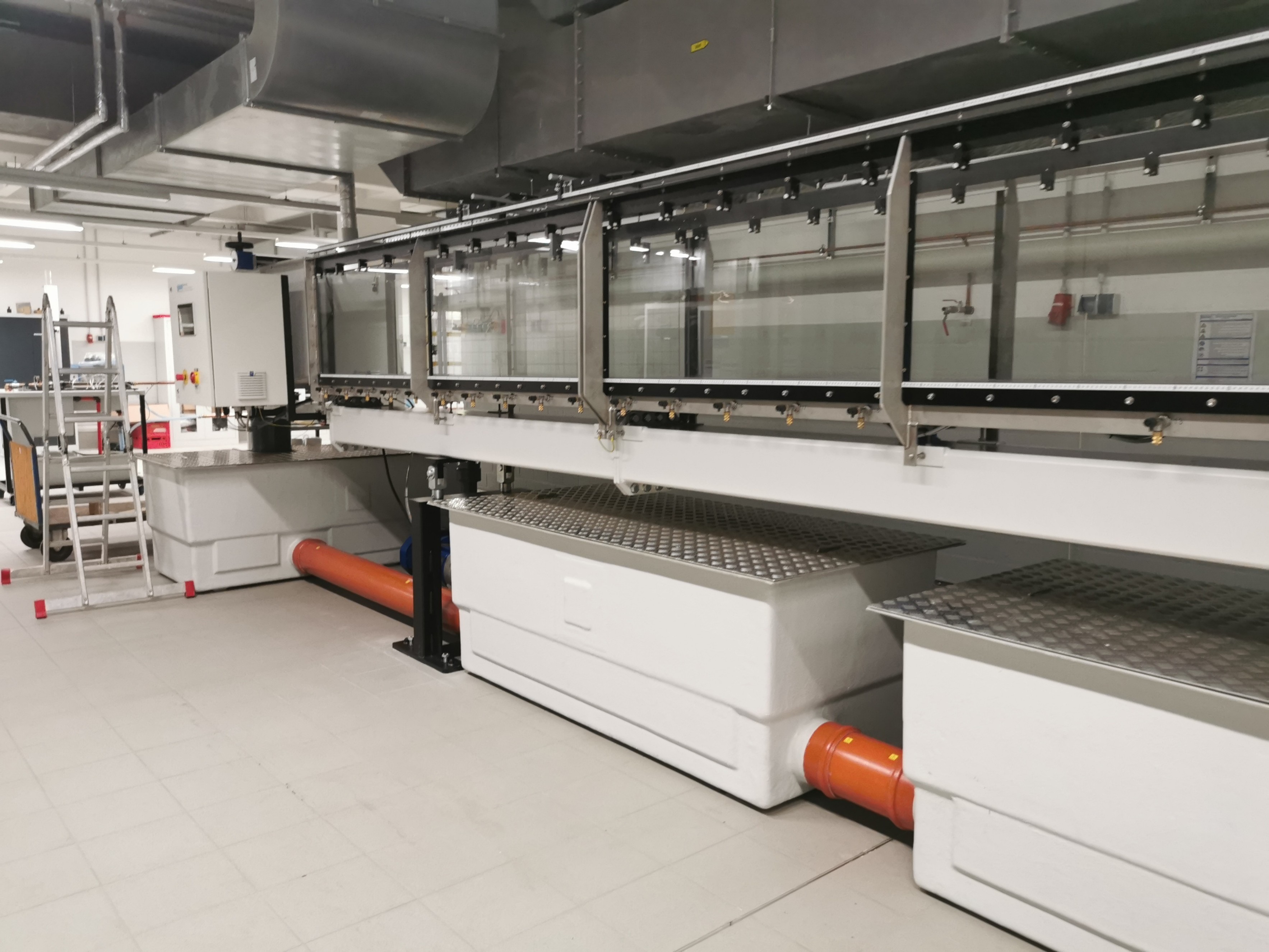 Hierzu steht eine eigens erstellte rechteckige Kipprinne mit einem Querschnitt von 790x480 mm zur Verfügung. Die Messtrecke umfasst 10 m. Der Wasserstand kann über ein Klappenwehr gesteuert werden. Die Aufzeichnung von Sensordaten erfolgt direkt an einem angeschlossenen PC in der Halle. Einzelne Messpunkte können dabei gezielt über eine motorbetriebene Traverse angesteuert werden.