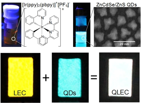 [28.09.2017] Dr. Ekaterina Nannen and Julia Frohleiks, who work in the junior research group “Solid State Lighting” at the “Electronic Materials and Nanostructures” group at the University of Duisburg-Essen, combined for the first time yellow LECs with blue light-emitting quantum dots. Quantum dots are colloidal nanostructures with a size of only 5 nanometers, which have exceptional physical and optical properties. The hybrid QD-LEC devices show stable white light emission while maintaining all benefits which are typical for LECs.