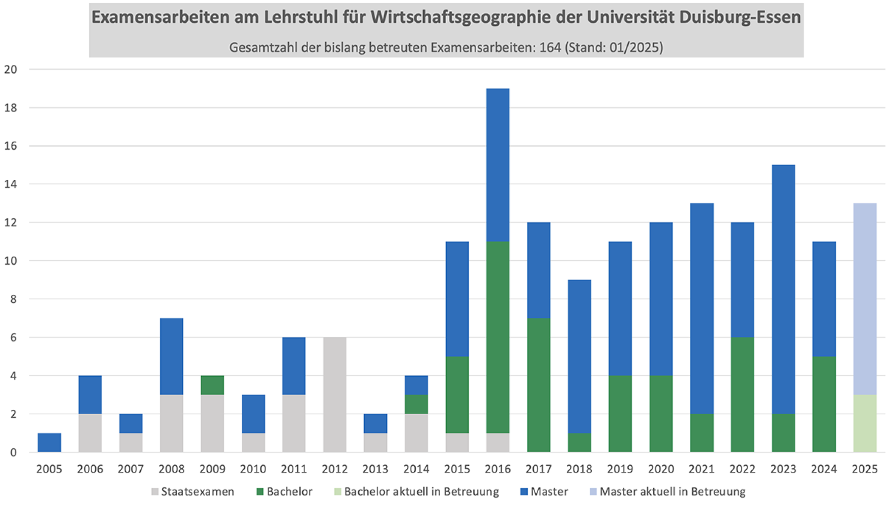 Um einen Einblick in die Vielfalt, der an unserem Lehrstuhl in Erstbetreuung entstandenen Examensarbeiten der verschiedenen Studiengänge zu geben, haben wir die Themen der betreuten Bachelor-, Master- und (früheren) Staatsexamensarbeiten tabellarisch nach Jahren zusammengestellt. Nahezu alle Themen zeichnen sich neben dem wirtschafts-, verkehrs- und/oder stadtgeographischen Bezug auch durch eine regional-geographische Anwendungsperspektive aus.