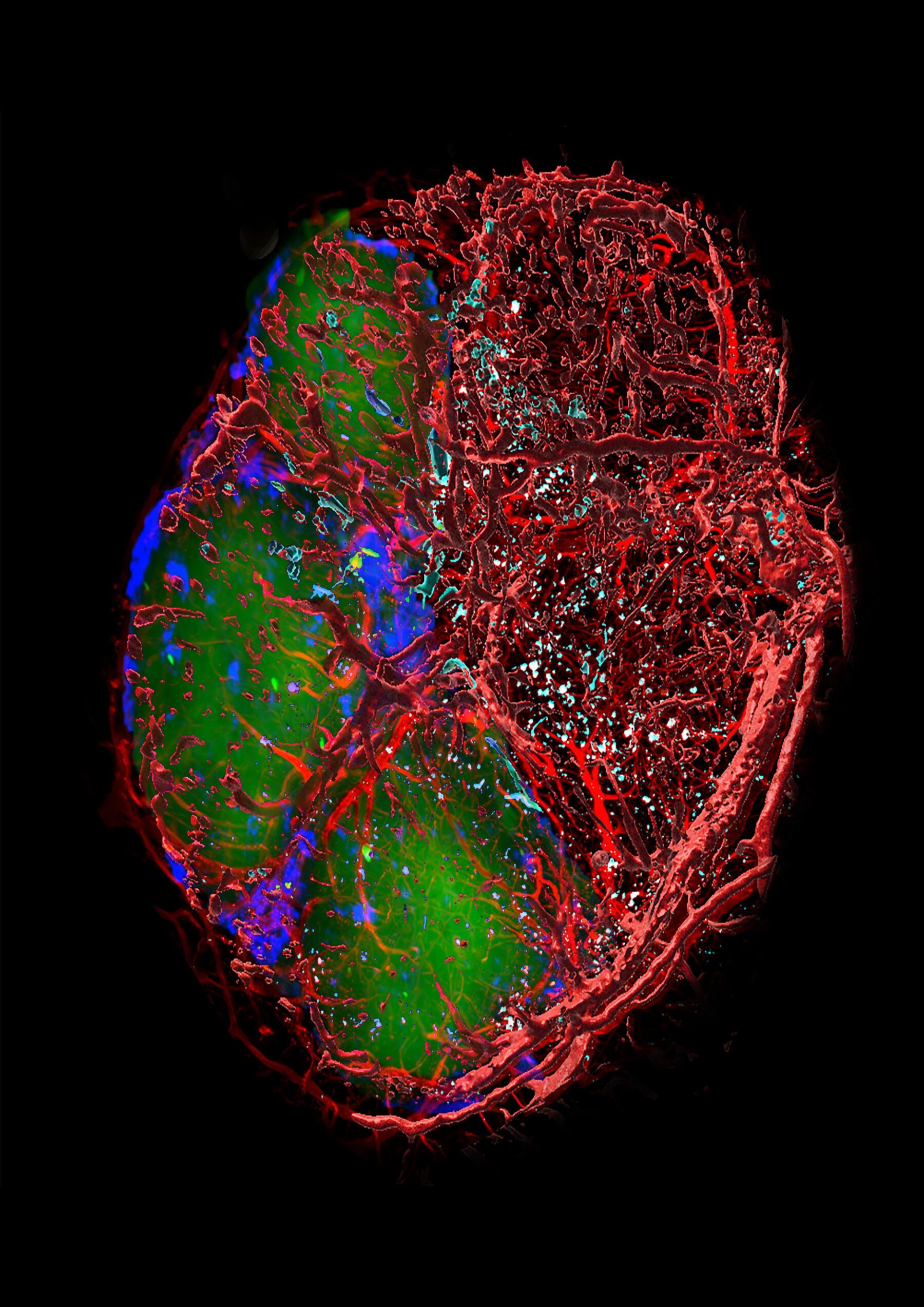 Das Bild zeigt ein isoliertes Peyer Plaque (PP, eine Art Lymphknoten im Darm) aus dem Darm einer Maus nach einem Schlaganfall. Zu sehen sind Ansammlungen von zwei verschiedene Immunzelltypen (B Zellen in grün, T Zellen in dunkelblau) sowie das Blutgefäßnetzwerk, das die Struktur durchzieht (rot). In türkis angefärbt sind Mikrothromben, die in den Gefäßen liegen und die Blutversorgung des PP stören. Nach einem Schlaganfall entstehen solche Mikrothromben regelmäßig. Durch die gestörte Blutversorgung kommt es zum Absterben der B- und T-Zellen und als Folge davon zu einem Verlust an immunologischer Abwehrkraft. Dies gilt für Mäuse, aber genauso auch für Menschen. In unserer Arbeit haben wir diesen Mechanismus aufgeklärt und gleichzeitig auch eine Therapie gefunden, die die Bildung der Mikrothromben und damit auch den Verlust der Immunabwehr bei Mäusen und Menschen komplett verhindert.