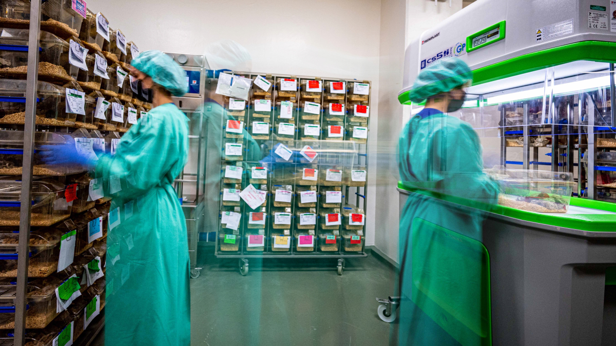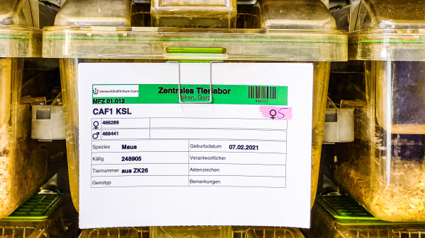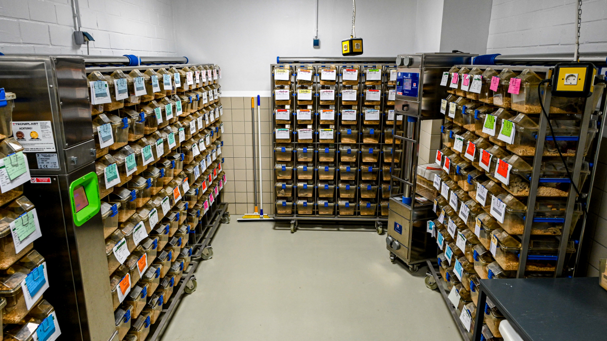 In solchen Räumen sind am Zentralen Tierlaboratorium Mäuse untergebracht. Zu sehen ist eine IVC-Haltung, bei der die Käfige in sogenannten Racks stehen. IVC (Individual Ventilated Cage) meint einen einzeln belüfteten Käfig, der mit einem Filterdeckel verschlossen ist. Jeder Käfig erhält durch die Belüftungseinheit HEPA-gefilterte Luft, sodass mögliche Krankheitserreger aus der Raumluft gefiltert werden und die Tiere sich somit nicht infizieren können. Die Abluft jedes Käfigs wird ebenfalls HEPA-gefiltert, wodurch eine Verbreitung von Krankheitserregern verhindert wird, z.B. über die Raumluft.