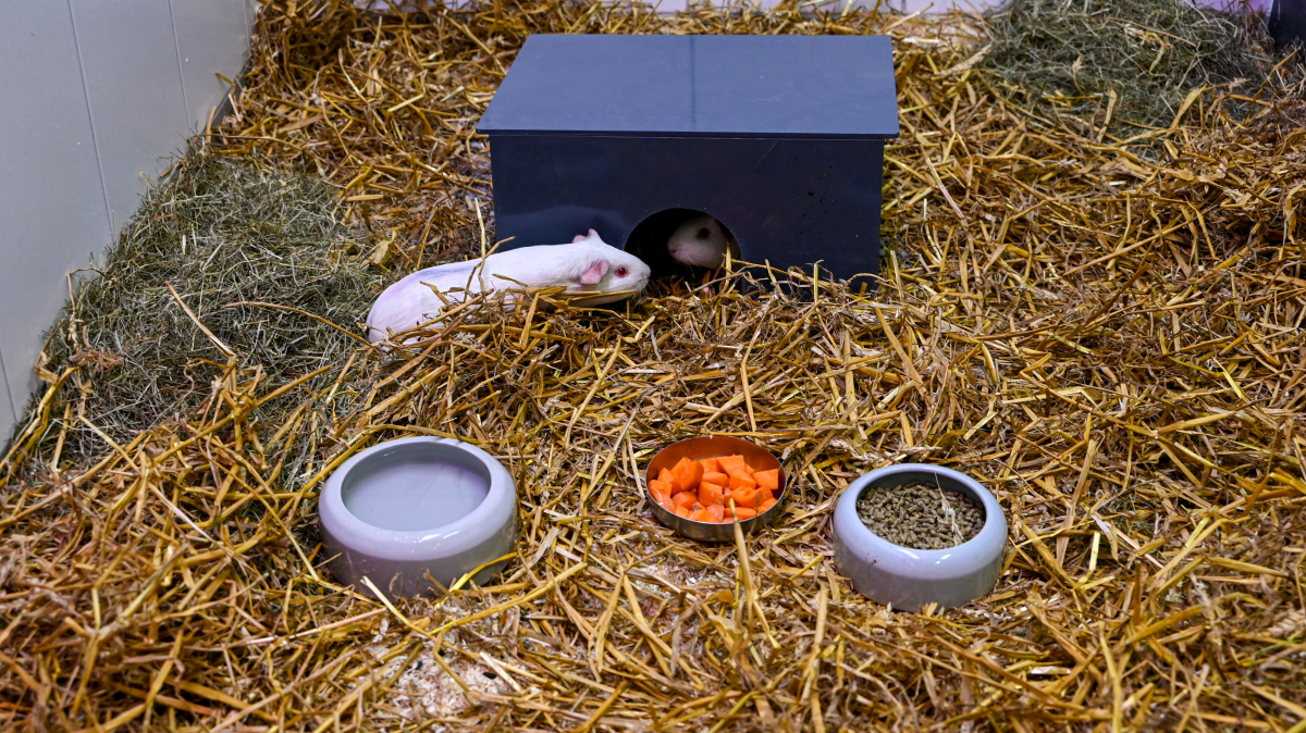 In dieser frischen Käfigschale ist das „Environmental Enrichment“ gut zu sehen. Diese „angereicherte Umwelt“ besteht aus einem roten Häuschen als Unterschlupf, einer Schicht Einstreu und Nistmaterial, in diesem Fall Zellstoff. Durch das rote Haus können die Tiere von außen beobachtet werden, fühlen sich dabei aber sicher. Da sie rotes Licht nicht wahrnehmen können, erscheint ihnen das Haus als dunkle Höhle. Das Nistmaterial wird genutzt, um ein wärmendes Nest anzulegen, welches auch der Regulation ihrer Körpertemperatur dient. Auch das Einstreu wird von den Tieren im Käfig neu verteilt und so eine strukturierte Wohnumgebung geschaffen. Für Mäuse ist die Gruppenhaltung für Männchen wie für Weibchen wichtig; nur so können sie ihr soziales Verhalten ausleben.