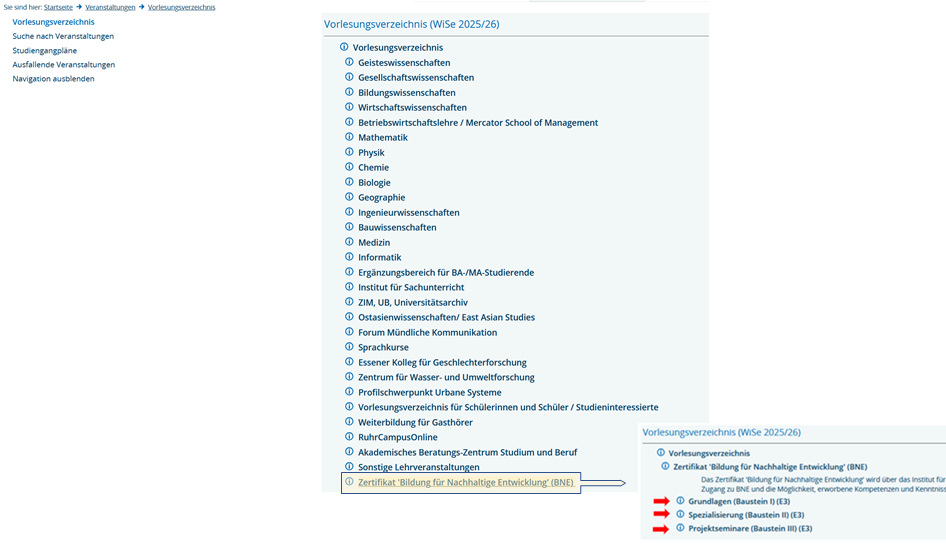 Im LSF wählen Sie hierfür oben rechts das entsprechende Semester aus und wählen dann Startseite > Veranstaltungen > Vorlesungsverzeichnis > Zertifikat 'Bildung für Nachhaltige Entwicklung' (BNE) > ... und den für Sie interessanten Baustein: