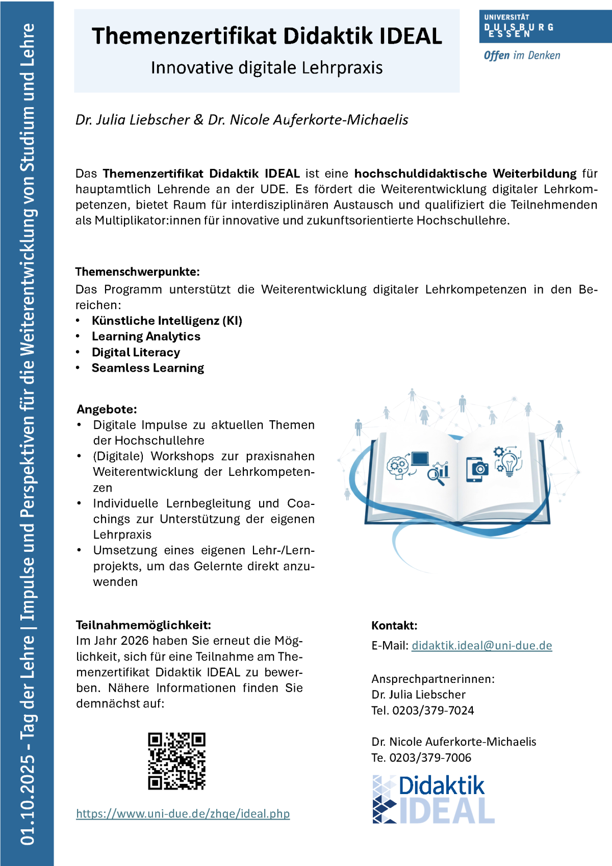 Das Themenzertifikat Didaktik IDEAL – Innovative digitale Lehrpraxis ist ein hochschuldidaktisches Weiterbildungsangebot der Universität Duisburg-Essen für hauptamtlich Lehrende. Es zielt darauf ab, die digitalen Lehrkompetenzen systematisch zu stärken und Lehrende als Multiplikator:innen für eine innovative und zukunftsorientierte Hochschullehre zu qualifizieren. Im Mittelpunkt stehen aktuelle Themenfelder wie Künstliche Intelligenz, Learning Analytics, Digital Literacy und Seamless Learning, die in praxisnahen Formaten aufgegriffen werden. Das Programm kombiniert digitale Impulse, Workshops sowie individuelle Lernbegleitung und Coachings, um die persönliche Lehrpraxis gezielt weiterzuentwickeln. Ein zentrales Element ist die Umsetzung eines eigenen Lehr-/Lernprojekts, durch das die Teilnehmenden ihr erworbenes Wissen direkt in die Praxis übertragen können. Durch den interdisziplinären Austausch und die nachhaltige Förderung von Innovationskompetenz trägt das Zertifikat zur Weiterentwicklung einer zukunftsfähigen digitalen Hochschullehre bei.