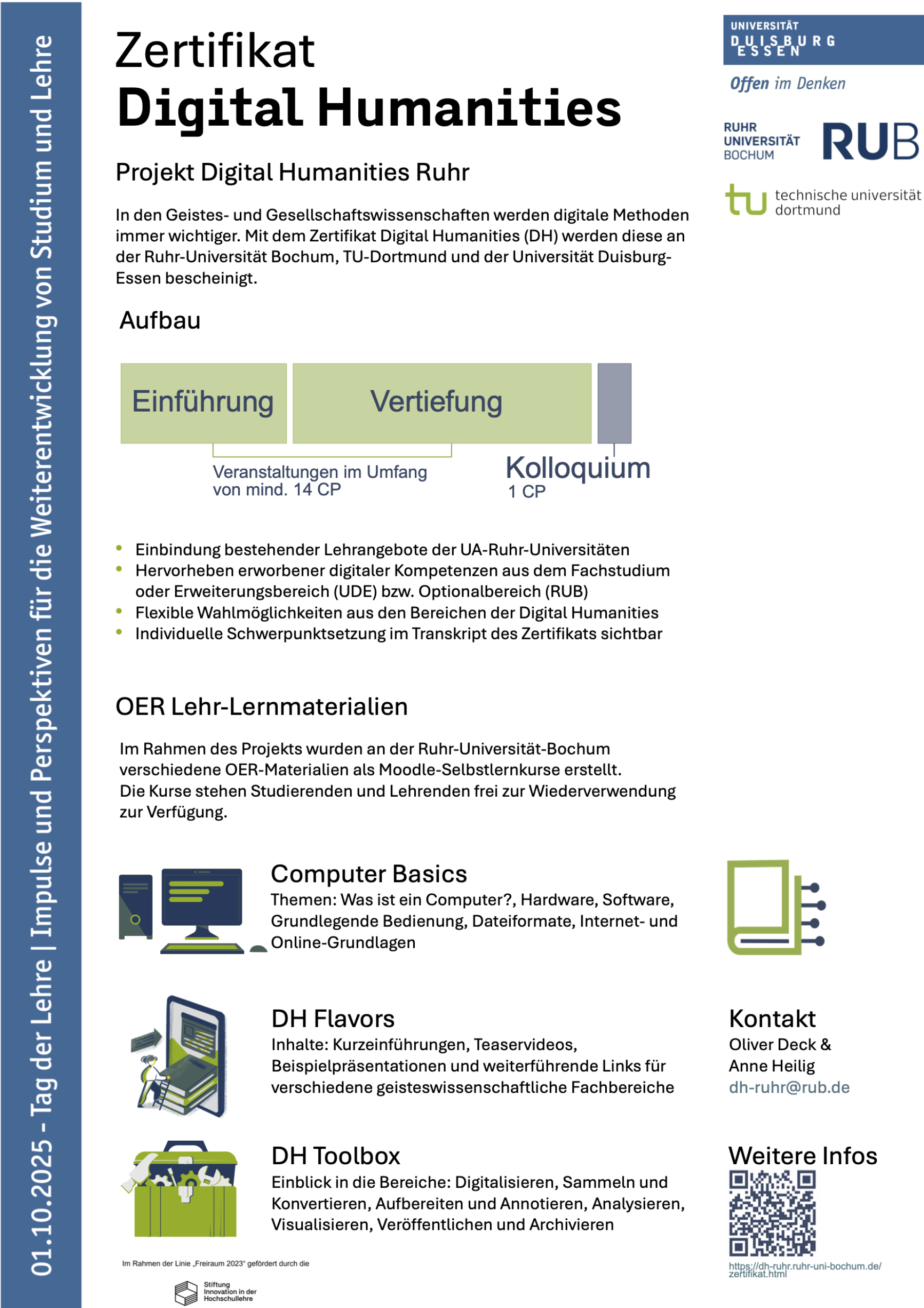 In den Geistes- und Gesellschaftswissenschaften werden digitale Methoden immer wichtiger. Mit dem Zertifikat Digital Humanities (DH) werden diese im Verband der UA-Ruhr-Universitäten bescheinigt. Studierende können damit nachweisen, welche digitalen Kenntnisse sie im Studium erlangt haben und so vielfältigere Chancen auf dem Arbeitsmarkt nutzen, egal ob in Forschung, in GLAM-Berufen (Galleries, Libraries, Archives, Museums), in NGOs oder Politik oder in der freien Wirtschaft. Das Zertifikat Digital Humanities der UA-Ruhr deckt einführende Informationen über die Digital Humanities und einen Vertiefungsbereich mit gezielter Anwendung von DH-Methoden und -Tools ab. Der Umfang beträgt mindestens 15 ECTS, darüber hinaus können aber auch weitere Veranstaltungen zertifiziert werden. Die Veranstaltungen können im eigenen Fachstudium oder im Optionalbereich (RUB) bzw. Ergänzungsbereich (UDE) belegt und angerechnet werden. In einem fächerübergreifenden Kolloquium werden die Ergebnisse eigener DH-Projekte vorgestellt. Durch flexible Wahlmöglichkeiten können Studierende so aus den vielen Anwendungsbereichen der Digital Humanities auswählen und ihren Schwerpunkt im Transkript des Zertifikats sichtbar machen. Im Rahmen des Projekts wurden an der RUB verschiedene OER-Materialien als Moodle-Selbstlernkurse erstellt: „Computer Basics“, „DH Flavors“ (mit Beispielprojekten) und „DH Toolbox“. Die Inhalte orientieren sich an einem im Projekt entwickelten DH-Framework, in dem relevante Kompetenzen und Fertigkeiten systematisiert wurden. Die Kurse stehen Studierenden und Lehrenden frei zur Wiederverwendung zur Verfügung.