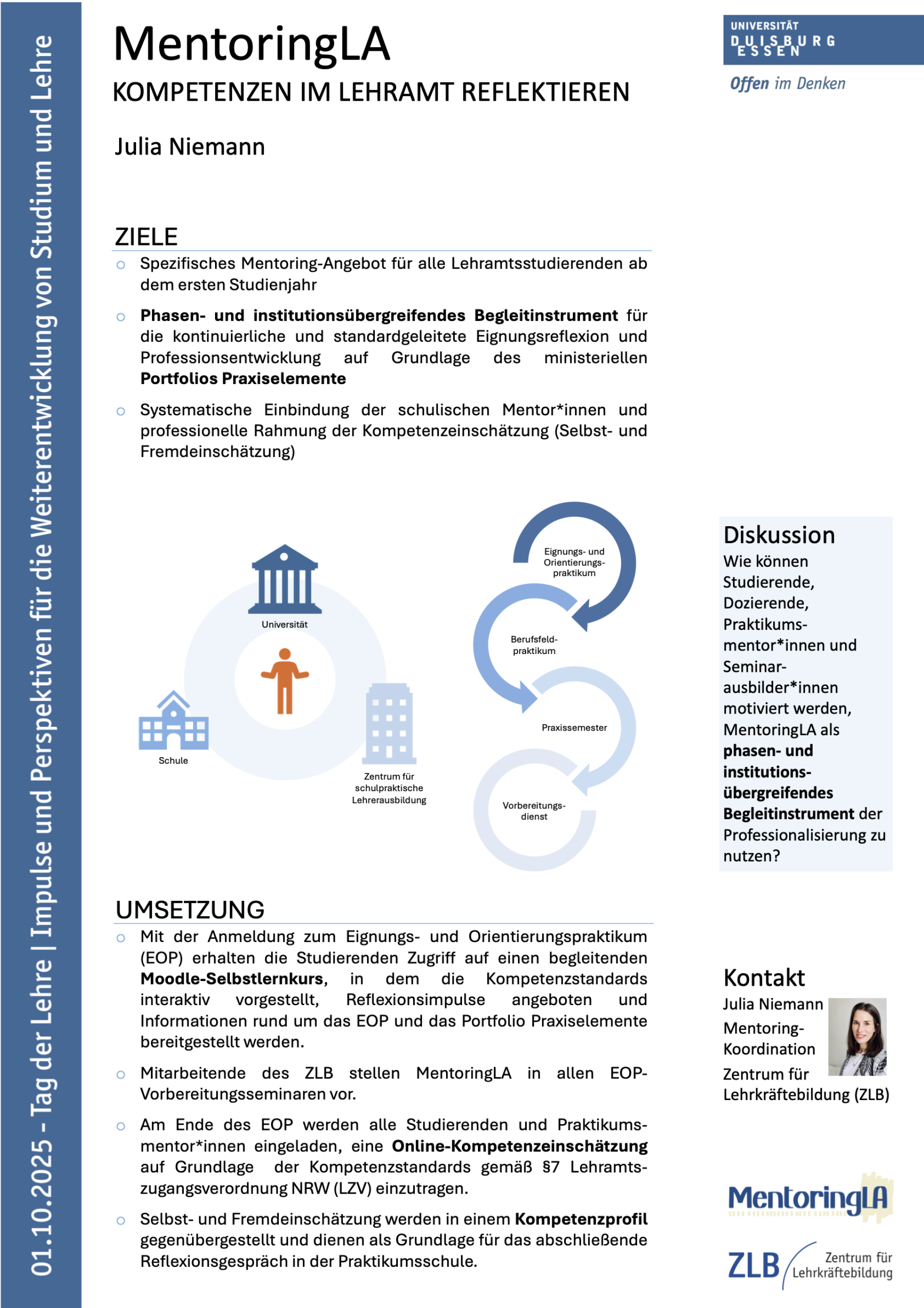 Das Mentoring im Lehramt (MentoringLA) an der Universität Duisburg-Essen setzt seit 2021 den Fokus auf die fachübergreifende, kontinuierliche und standardgeleitete Eignungsreflexion und Professionsentwicklung auf Grundlage des ministeriellen Portfolios Praxiselemente. Es bietet als Teil des Unterstützungsangebots des Zentrums für Lehrkräftebildung (ZLB) ein phasen- und institutionsübergreifendes Reflexionsinstrument. In Form einer 180°-Online-Kompetenzeinschätzung am Ende des Eignungs- und Orientierungspraktikums (EOP) werden die in § 7 der Lehramtszugangsverordnung (LZV) formulierten Kompetenzstandards reflektiert. Die systematische Fremdeinschätzung der schulischen Mentor*innen und die Selbsteinschätzung der Studierenden werden in einem Kompetenzprofil gegenübergestellt. Dieses bietet eine Grundlage für das abschließende EOP-Reflexionsgespräch in der Praktikumsschule und unterstützt die Professionsentwicklung der Studierenden. Perspektivisch soll dieses Instrument den individuellen berufsbiografischen Entwicklungsprozess über weitere Praxisphasen hinweg abbilden und als digitales Entwicklungsportfolio dienen, das analog zum Reflexionsteil des Portfolio Praxiselemente eingesetzt werden kann und dessen Funktion als „roter Faden“ und kohärenzstiftendes Bindeglied zwischen den beteiligten Institutionen stärken soll.