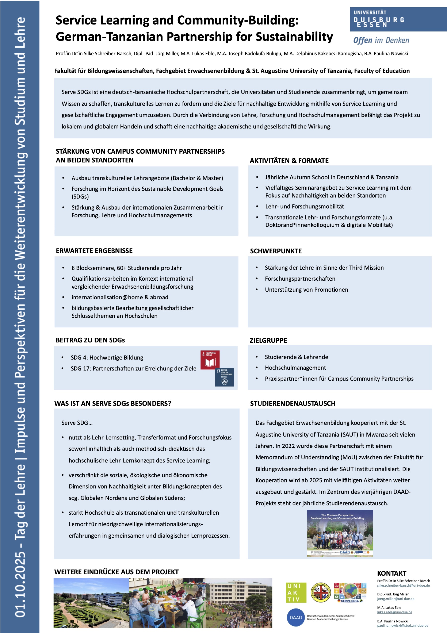 In einer 4-jährigen Förderphase(Projektkennziffer: 57753724) durch den DAAD (2025-2028) setzen die UDE (IBW/Fakultät für Bildungswissenschaften & UNIAKTIV/IwiS) und die St. Augustine University of Tanzania ihre seit Jahren aufgebaute Kooperation fort, um durch die Verbindung von Lehre, Forschung, Hochschulmanagement und Community zu lokalem und globalem Handeln zu befähigen und eine nachhaltige akademische und gesellschaftliche Wirkung zu entfalten.
