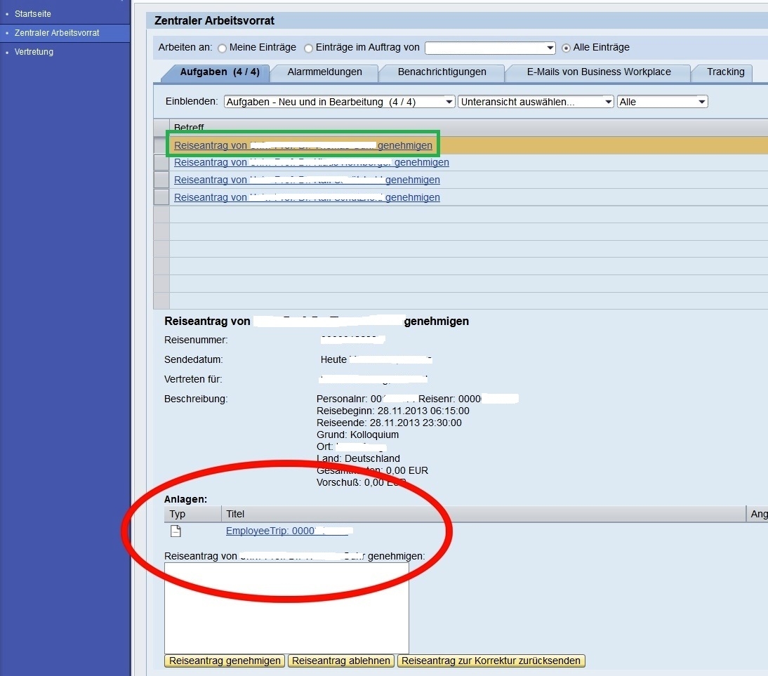 - Details zu zu genehmigenden Dienstreisen sind nicht sichtbar Problem:Es sind keine Details mehr zu zu genehmigenden Dienstreisen sichtbar. Nach einem Klick auf die Anlage (Employee Trip: .....) erscheint die angehängte Fehlermeldung 'Submit Berechtigung WF_INTRN für Programm RSWUOBJEXCL ist erforderlich'Lösung:Sie dürfen nicht auf die Anlagen, sprich den Link EmployeeTrip: ########## klicken, sondern müssen auf den Link des jeweils zu genehmigenden Antrags - oben in der Tabelle - klicken.