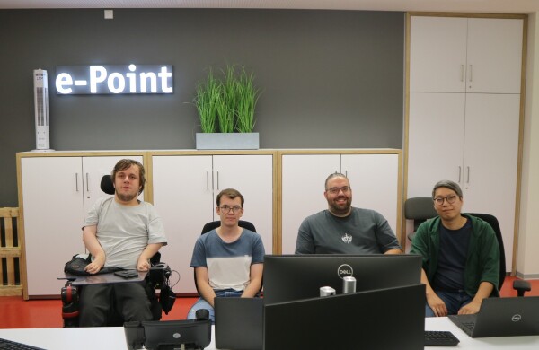 (Das Foto vom e-Point Essen zeigt Niklas (ehemaliger Azubi), Karol, Ausbilder Lars und Jefferey).