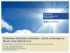 Im Vortrag wird sowohl auf die sichere Konfiguration von Geräten im UNI-WLAN "eduroam", als auch auf aktuelle Angriffe eingegangen, die passwortgeschützte Heimnetzwerke betreffen. Auch der sichere Umgang mit offenen WLANs, wie z.B. in Internetcafés oder in den ICEs der Bundesbahn werden thematisiert. Als kleines "Special" werden auch aktuelle Angriffe auf das Bluetooth-Protokoll vorgestellt. Aufgelockert wird der Vortrag durch ein Live-Hacking. Sowohl Netzwerk-Laien als auch erfahrene WLAN-Nutzer sollen angesprochen werden.