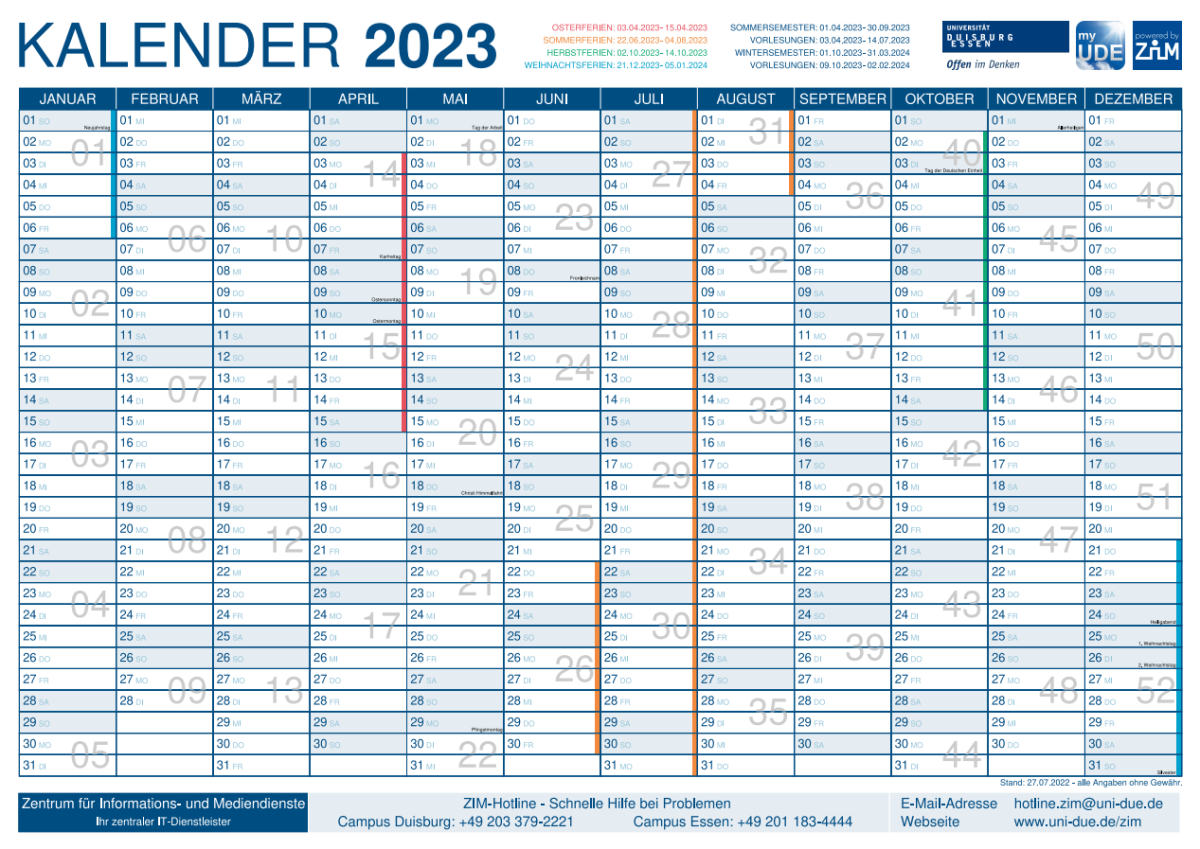 Der Druck des Kalenders kann einfach über das Universitätsdruckzentrum (https://www.uni-due.de/verwaltung/udz/) beauftragt werden. (Es ist ein PSP-Element erforderlich).