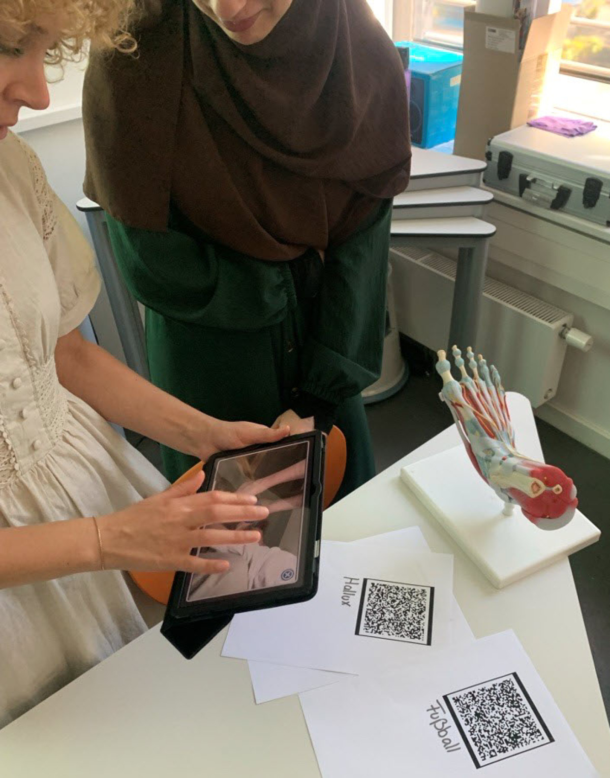 Im Zentrum stand ein haptisches 3D-Modell eines Fußes. Um diesen herum entwickelten Studierende des Masterstudiengangs Erwachsenenbildung unter Leitung von Dr. Miriam Mulders (Lehrstuhl für Mediendidaktik und Wissensmanagement) in Kleingruppen didaktische Konzepte für den Einsatz der App. Die adressierten Zielgruppen reichten von Fußballerinnen über medizinisches Personal, für die konkrete Anwendungsszenarien ausgearbeitet wurden.