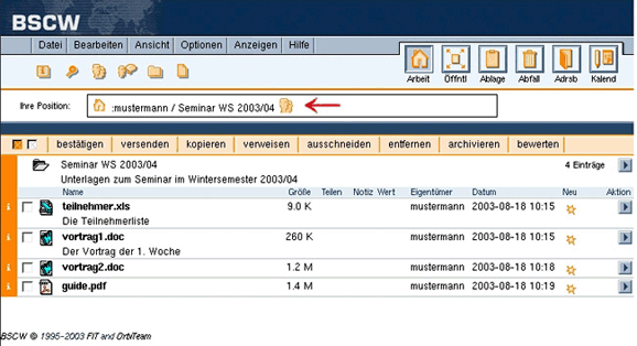 Nach Bestätigung durch OK gelangen Sie wieder zur Übersicht des Arbeitsbereiches; die Einladungen an die neuen Mitglieder werden verschickt. Diese müssen sich dann registrieren. Informationen dazu finden Sie unter Persönlicher Zugang zum BSCW-Server.