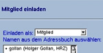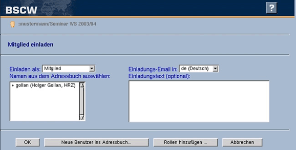 Dabei können Sie entweder die BSCW-Nutzerkennungen (für bereits im System registrierte Nutzer) oder die E-Mail Adressen der neuen Teilnehmer angeben. Eine Bestätigung durch OK führt Sie wieder zurück zum alten Formular, in dem jetzt allerdings das Adressbuch mit den neuen Einträgen gefüllt ist und diese auch bereits ausgewählt wurden. (Sollten Sie nicht das Recht zum Einladen neuer Mitglieder in BSCW besitzen, so wird dieser Fall hier zu einem Fehler führen; fremde E-Mail Adressen werden dann nicht akzeptiert.)