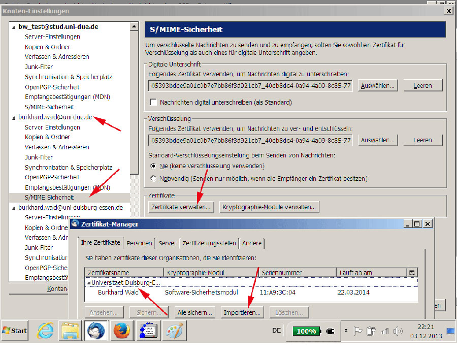 - Hier sollte nun als 'Signaturzertifikat' und als 'Verschlüsselungszertifikat' Ihr Zertifikat (Universitaet Duisburg-Essen) eingetragen sein.