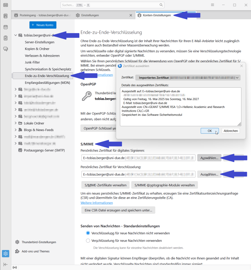 - Hier sollte nun als 'Signaturzertifikat' und als 'Verschlüsselungszertifikat' Ihr Zertifikat (Universitaet Duisburg-Essen) eingetragen sein.