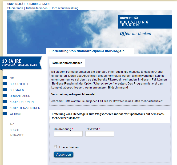 Aufgrund der stetig steigenden Anzahl von Werbemails, auch als SPAM bezeichnet, wird auf den eingehenden E-Mail-Servern eine Bewertung der E-Mails nach bestimmten Kriterien vorgenommen. Dieses geschieht für von außen kommende E-Mails direkt auf den Maileingangsservern und für intern verschickte E-Mails über die Software SpamAssassin.