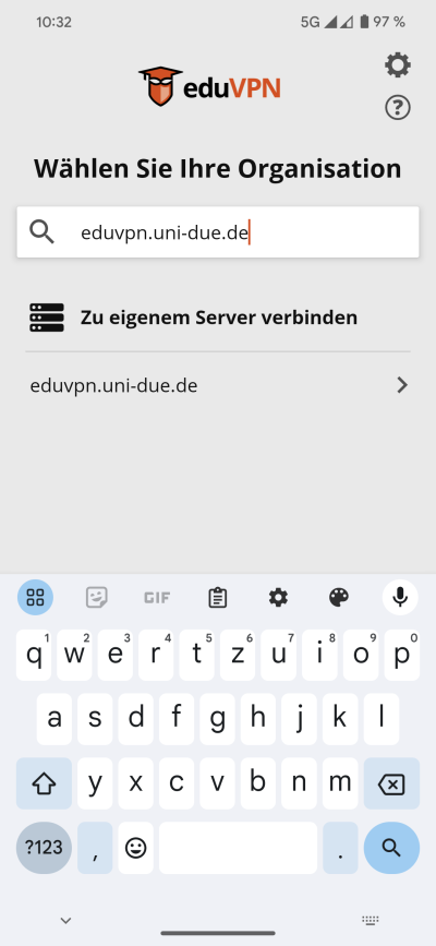 - Mit eigenem Server verbinden auf eduvpn.uni-due.de klicken