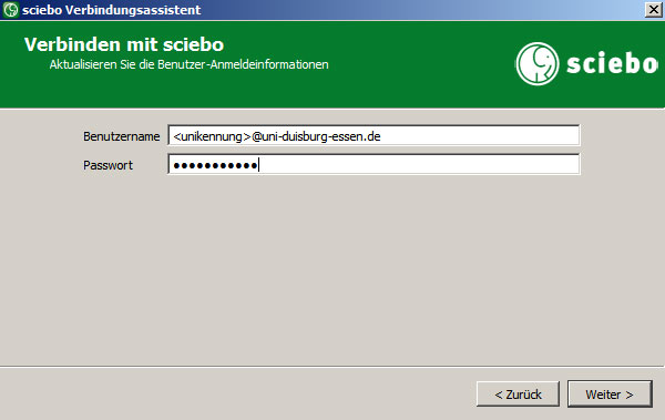 Als Passwort tragen Sie bitte das Sciebo-Passwort (das von Ihnen für Sciebo gewählte Passwort, nicht das Uni-Passwort) ein.
