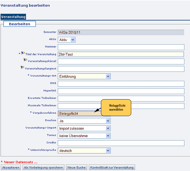 Im folgenden Tutorial lernen Sie Schritt für Schritt wie Sie in LSF eine Veranstaltung eintragen und dabei die Belegfunktion nutzen können. (Durch Klicken auf die Bilder erhalten Sie jweils ein Sreenshot des gesamten Bildschirmes.)
