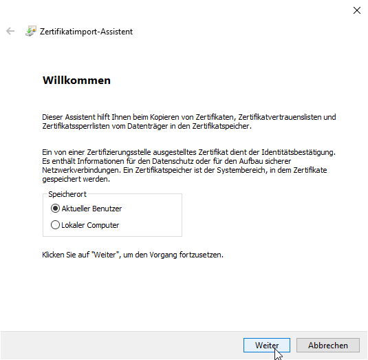 Bestätigen Sie 'Zertifikatsspeicher automatisch auswählen' und 'Weiter'.