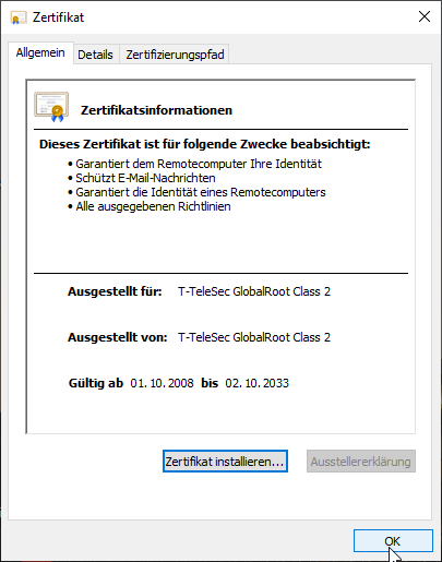 Wenn das Wurzelzertifikat T-TeleSec_GlobalRoot_Class_2.crt in Ihrer Installation noch nicht vorhanden ist, muss dieses nachinstalliert werden.