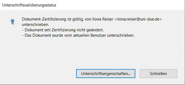 Beim Öffnen des Dokumentes kann die Zertifikats- und Signaturinformtion durch klicken auf 'Signatur' angezeigt werden: