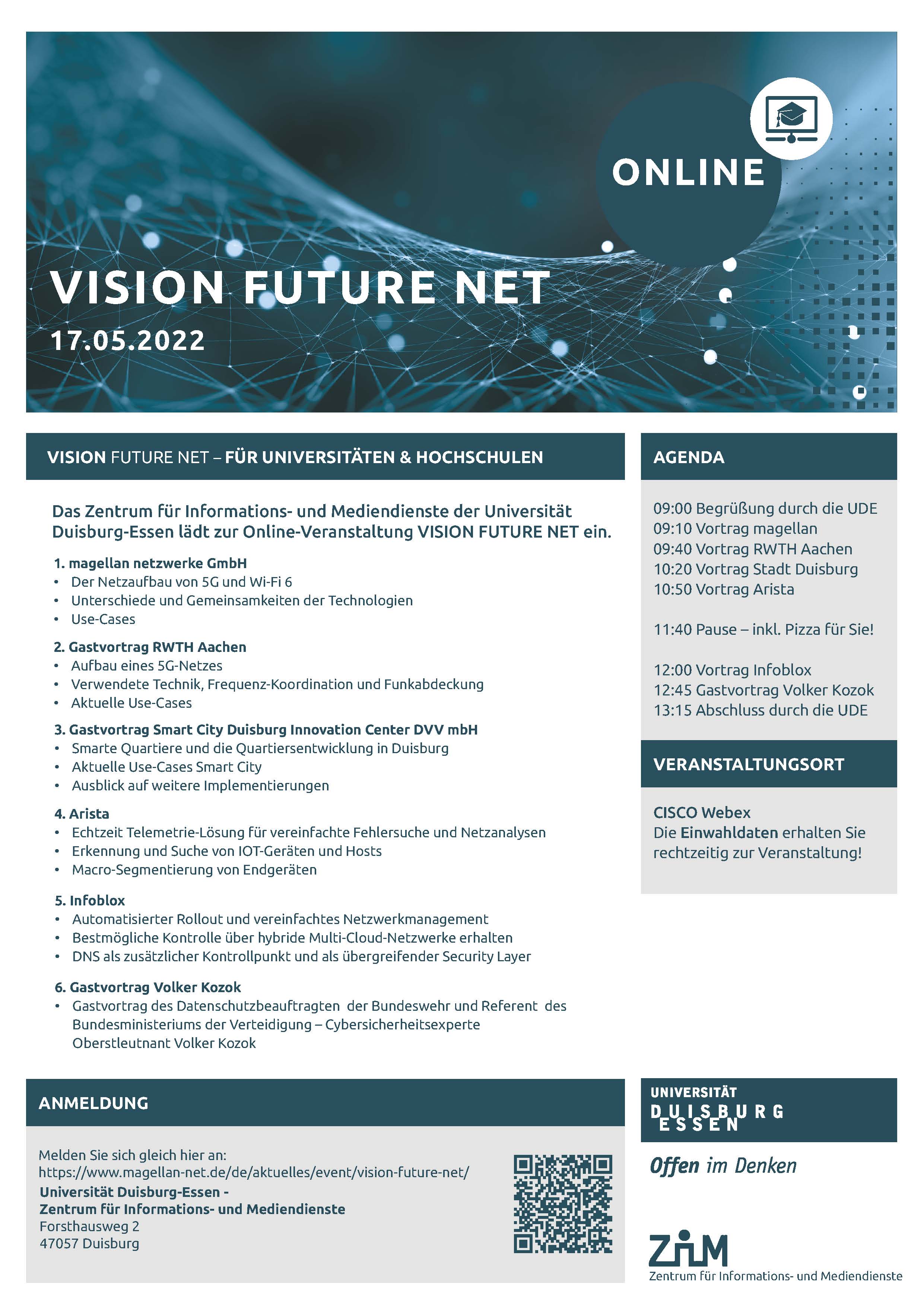 Das Zentrum für Informations- und Mediendienste der Universität Duisburg-Essen lädt zur Online-Veranstaltung VISION FUTURE NET ein.