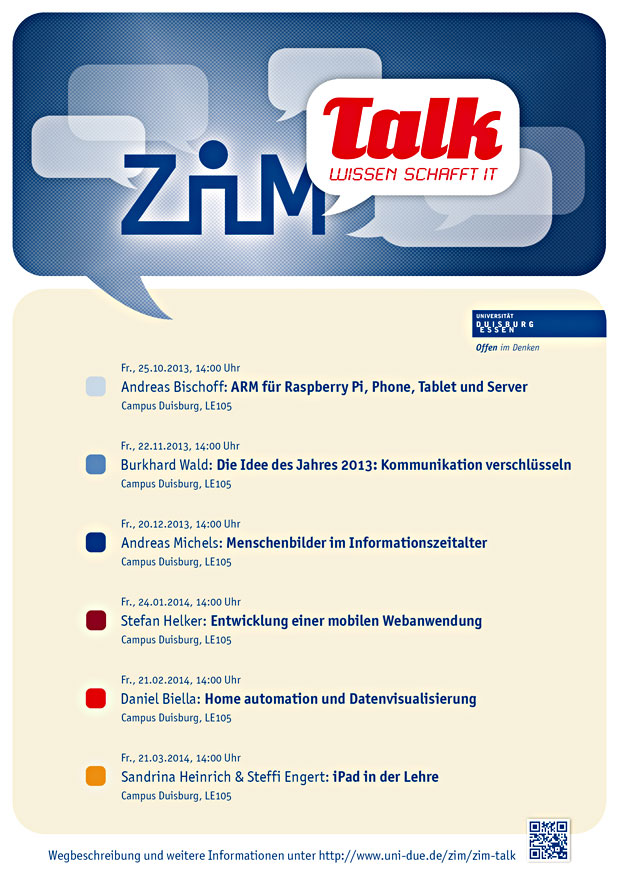 Das ZIM hat im WS 13/14 alle interessierten Uni-Angehörigen, Studierende wie Mitarbeitende, zu seiner Vortragsreihe über zentrale IT-Zukunfts-Themen eingeladen. Im ZIM-Talk wurden neue technische Entwicklungen und praktische Einsatzmöglichkeiten des mobilen Webs, aber auch Fragen zur Datenverschlüsselung und zum Menschenbild im Informationszeitalter thematisiert.