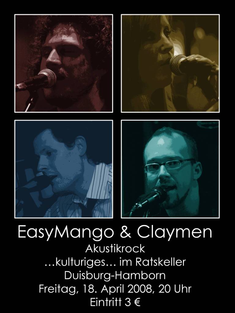 es ist wieder soweit: am 2008-04-18 gibt es wieder ein Akustikkonzert von Claymen und EasyMango in gemütlicher Atmosphäre im Kulturzentrum '…kulturiges…' im Ratskeller Duisburg-Hamborn. Die Location hat sich in letzter Zeit zu einem Geheimtip für Kultur und Musik in Duisburg gemausert. So hat dort zuletzt z. B. Ray Wilson (u. a. Sänger bei Genesis, Stiltskin) gespielt.