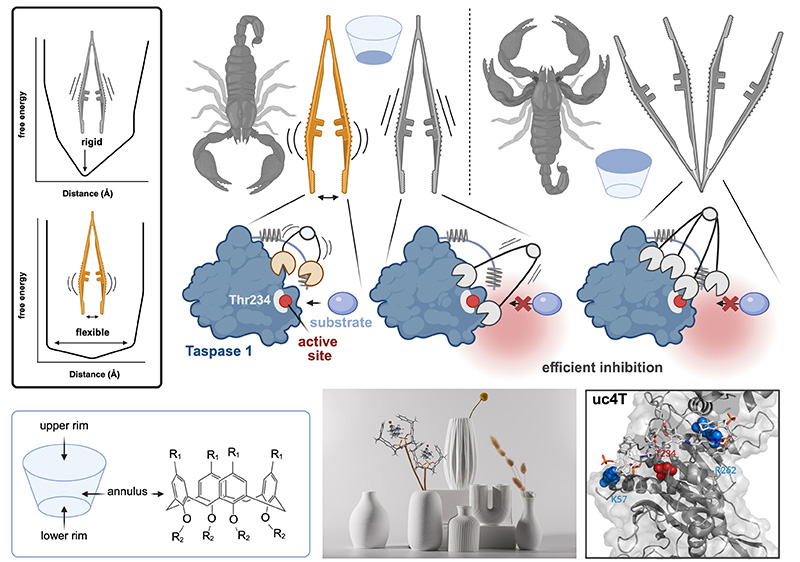 Taspase 1 is a cancer-associated protease that plays a key role in cellular regulation and represents a challenging target for therapeutic intervention. In our study, we developed a series of specially designed calixarene-based molecular tweezers that are preorganized to interact precisely with Taspase 1. By carefully controlling the rigidity, valency, and arrangement of the binding units, these tweezers can selectively engage key residues within a flexible loop near the enzyme’s active site. We found that the most rigid and well-structured tweezers were the most effective at disrupting the interaction between Taspase 1 and its partner protein Importin α, thereby inhibiting the protease’s activity. Molecular simulations showed that these rigid constructs remain stably anchored at defined sites, in addition blocking access to the active site, whereas more flexible tweezers were less potent. Testing different modifications revealed that while polar groups improved solubility, increased multivalency and structural rigidity were critical for maximal inhibitory activity. Overall, our results demonstrate that highly preorganized calixarene tweezers act as potent allosteric inhibitors of Taspase 1. This study establishes a clear relationship between the tweezers’ structure and their functional performance, providing a blueprint for designing synthetic ligands that can selectively modulate proteolytic enzymes. Beyond Taspase 1, these findings highlight the potential of supramolecular scaffolds to target challenging protein surfaces and open new avenues for therapeutic and chemical biology applications.